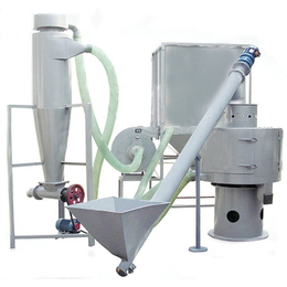 微細(xì)粉物料經(jīng)進料斗流入進料口,立即擴散并與空氣混合成霧狀,經(jīng)旋轉(zhuǎn)風(fēng)輪的作用,呈旋風(fēng)狀噴射過網(wǎng),在引風(fēng)機的作用下,氣體與細(xì)粉全部進入沉降室,成品細(xì)粉沉降后由下部排出,帶有少量粉塵的氣體進入除塵布袋,經(jīng)凈化后排出袋外。顆粒直徑大于網(wǎng)孔的物料不能過網(wǎng),落入篩盤內(nèi)由排渣口排出機外。